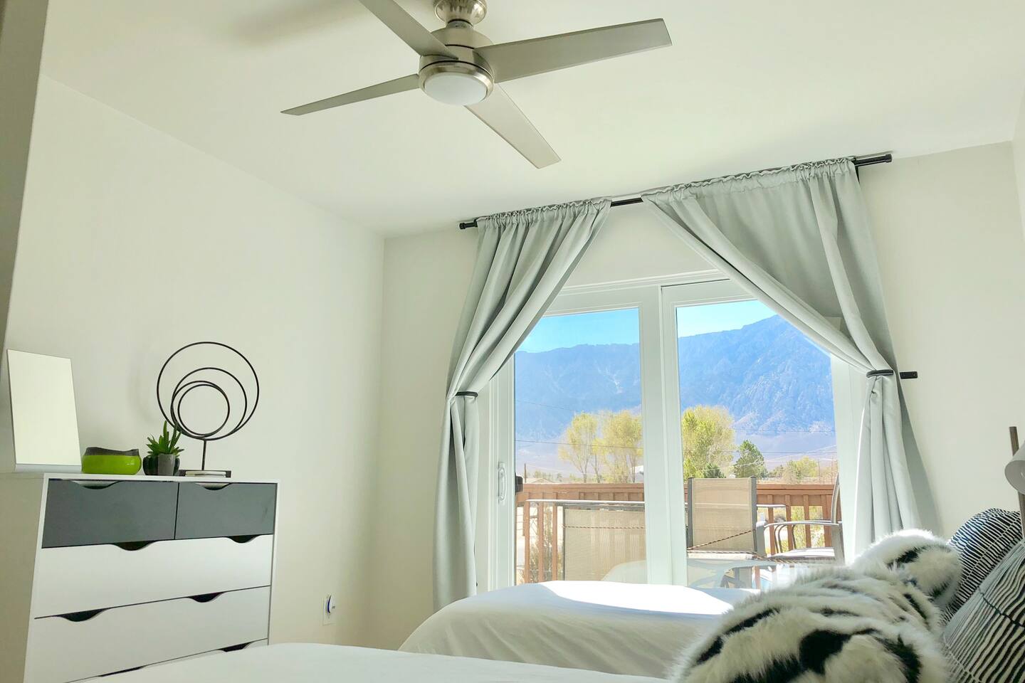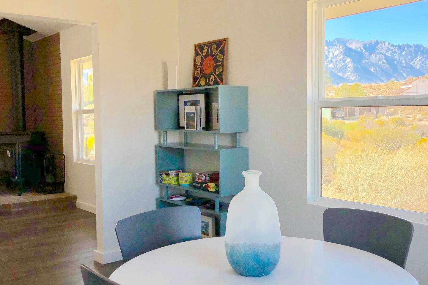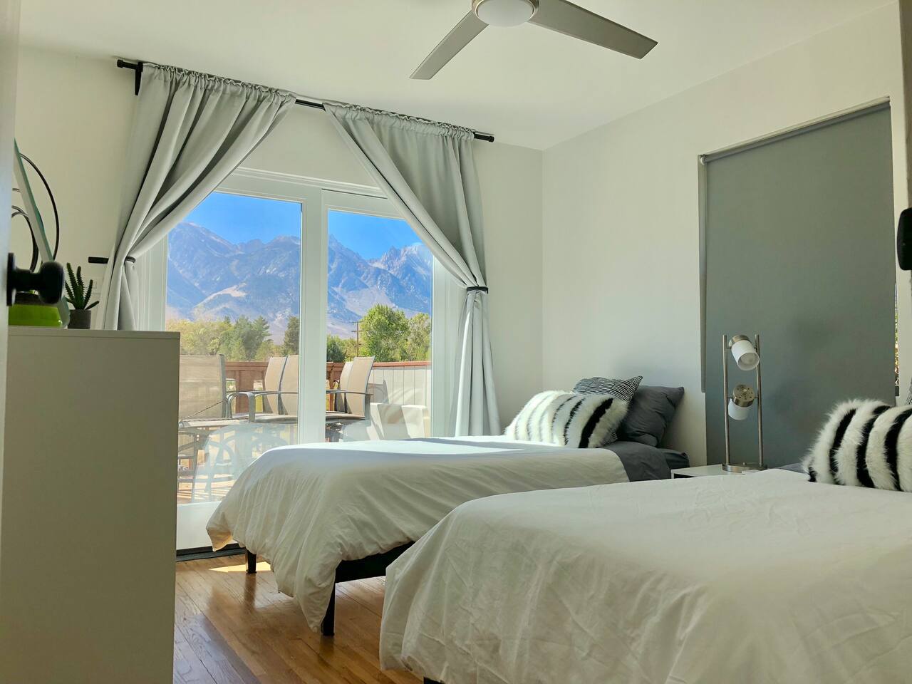 "And into the forest I go, to lose my mind and find my soul" John Muir With breathtaking views from every direction and every room, transport your mind, body and spirit to our secluded, yet ideally located, spacious 4 bedroom, 3 bath sanctuary in wondrous Alabama Hills! The house rests among stunning views of the surrounding and infamous Alabama Hills, Eastern Sierras, Mount Whitney and Inyo Mountains. Our home features well-appointed, comfortable interior spaces and outdoor areas for relaxing and playing on 5 acres of native desert landscape. Outdoor sitting areas around the house provide enchanting views of shifting light on the horizon of rugged mountain lands, and cozy spaces to watch sunrise, sunset, moonrise, and starry night skies. Perhaps you'd like to prepare a big, leisurely breakfast with your friends and family in our bright, fully-stocked kitchen with stools, lots of counter space, and a high vaulted ceiling, or sip your drink on the deck while gazing at the sunsets over the Eastern Sierra Mountains. Just relax and bask in the quiet serenity. The living room, during the summer, features an inviting, wrap around couch, 55" flat screen tv, and bluetooth sound bar. In the winter, the living room moves into the room with the fireplace. Perhaps one of the most exciting features - our game area offers a great space to entertain with a ping pong table, board games and table to set up with snacks to fuel your fun and keep the competitions going. The mid century designed master bedroom has a new queen bed with a very comfortable Tuft & Needle Adaptive® foam mattress, and private bathroom with newly tiled shower and double sink. It also features a work space and balcony with awe-inspiring views of the ever changing hues of the Inyo Mountains. It is well worth waking up early to catch the sunrise over the Inyo Mountains or even the sunsets coloring the sky. The second bedroom has a queen size bed and the third bedroom has two twin beds. Both of these rooms share a full bathroom with tub/shower and two sinks. The second and third bedroom also share a large deck furnished with seating to enjoy the amazing views of the Eastern Sierra mountains or star gaze at night. The fourth bedroom is downstairs, furnished with a comfortable memory foam queen mattress and detached bathroom with shower. Ideal for the family member that can't do stairs. Once inside the house, it is all one level with easy wheelchair access. There is also a loft space with a lounge chair to cozy up in solitude with a nice book, listen to music with an old CD collection or just to enjoy the view. Enjoy the stunning view of Lone Pine Peak and Mount Whitney from our front deck that comes installed with a refreshing misters extending all the way around the deck to cool you off after a day in the sun! Also enjoy the fire pit in the evening. The back deck has a bbq, picnic table for dining and Adirondack chairs surrounding a second fire pit. This deck has views of the Inyo Mountains and the large boulder formations of the Alabama hills located on our property! We provide you with all linens, towels, and many bathroom amenities you may need during your stay, and if there is something else you need, please let us know ahead of time and we will do our best to accommodate you! Guests are able to use the washer and dryer in the laundry room as well. Tap into your adventurous spirit and choose from countless wilderness excursions within just minutes of our home - whether it's exploring the uniquely breathtaking Alabama Hills, hiking in the Sierra high country to swim in pristine alpine lakes, summiting Mount Whitney, or simply setting off on dozens of nearby hiking/walking trails - the choice is yours! We really think you will love our comfortable, beautifully inspired home nestled amongst some of California's most stunning wilderness and natural resources as much as we do, and we are excited for you to see for yourself! Thank you for considering us for your stay, and we look forward to hosting you! We continue to take extra steps to clean and sanitize frequently touched surfaces between reservations. We also provide hand sanitizer, anti-bacterial sprays and disinfecting wipes for your peace of mind.