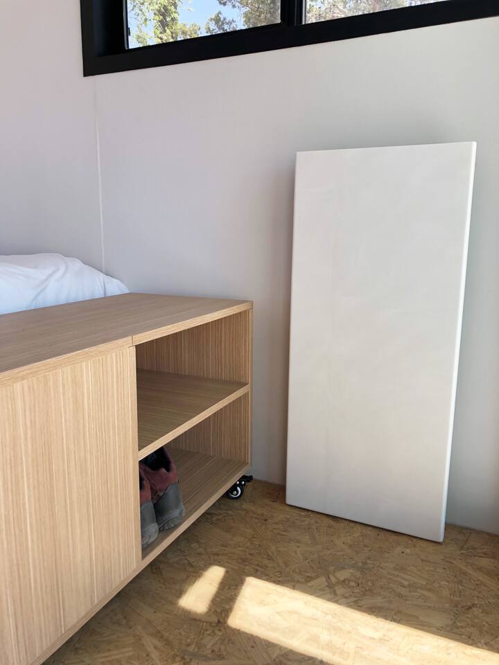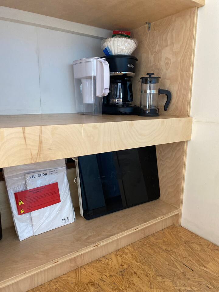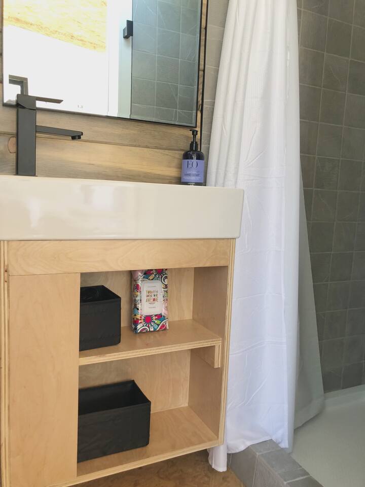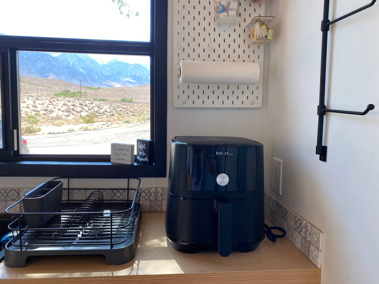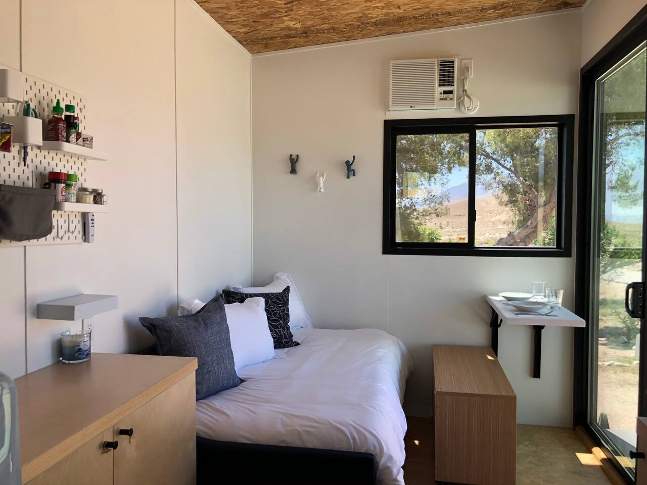 Our home is only 16' long (8'x16') but has a well-equipped kitchenette, full bath with a shower and a conventional toilet. The kitchenette has the basics and then some... a coffee maker / toaster oven / griddle all in one, a portable induction cook top, pots and pans, cooking utensils, basic spices and condiments. It also has a Britta water pitcher/ filter for your convenience! The living / sleeping space is a twin size sofa / daybed with a pull out trundle. The foam mattress size is 38" x 75" for both beds. The top mattress is 8" thick with a weight capacity of 400 lbs and the trundle is 6" thick with a weight capacity of 250 lbs. This may not have enough support or may be uncomfortable for some. The dining space has a movable coffee table /bench /shoe rack/ storage with locking brakes and a lift up dining table / office desk. The bench also stores the 2nd comforter for the bottom bed. TINY is very well insulated with Rockwool in all walls, ceiling and floor, has a built in mini split AC/Heater with remote control, dual pane windows and doors, tinted glass and black out shades for your comfort and enjoyment. TINY only has 50 amps of power and the on demand water heater requires 50 amps. Only 2 lights are able to be used while taking a hot shower. The breaker may possibly shut down and would need to be reset by turning it off and then on again (This has not happened in over a year but, just in case) CAUTION: Things appear smaller than they feel like inside! Driving up you may think, "OMG, it's so small", but after you step inside, you will hopefully feel, "WOW, it feels bigger than it looks". The 395 highway may be too close and light sleepers may feel it is still too noisy. Please do not book and leave a bad review if this would bother you. Thank you!